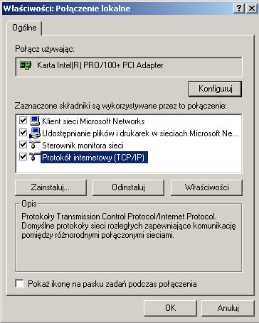 3. W oknie Właściwości: Połączenia lokalne zaznaczyć Protokół internetowy (TCP/IP) i kliknąć przycisk Właściwości.